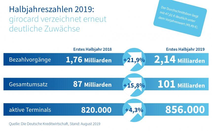 So stieg die Anzahl der Transaktionen im Vergleich zum Vorjahreszeitraum um 21,9 Prozent. Insgesamt zahlten die Kunden von Januar bis Juni dieses Jahres rund 2,14 Milliarden Mal mit ihren physischen und digitalen girocards (erstes Halbjahr 2018: circa 1,76 Milliarden Transaktionen).