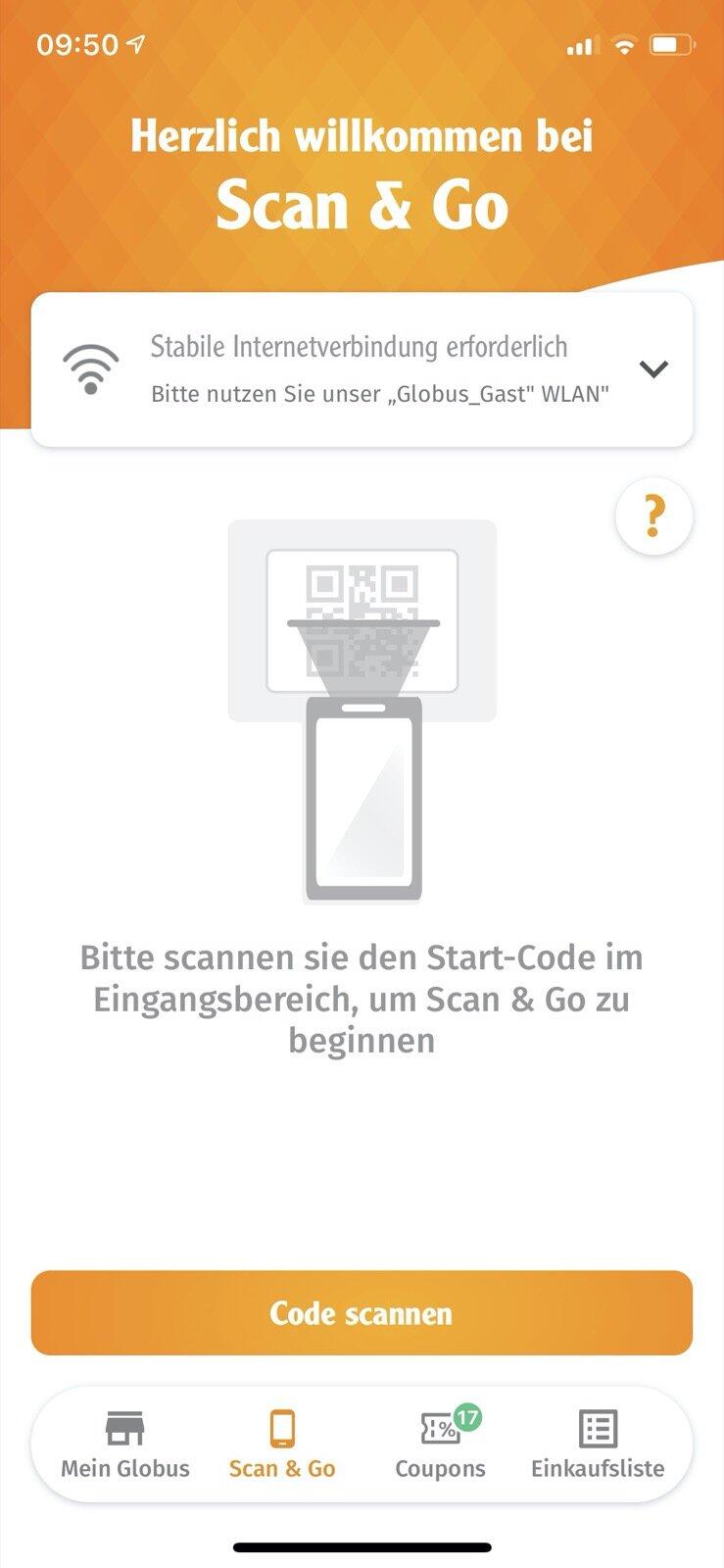 Zur Nutzung von Scan & Go mit dem Smartphone ist eine stabile Internetverbindung erforderlich. Wer das nicht haben sollte bzw. das o2-Netz nutzt, für den stellt Globus ein kostenloses WLAN im Markt bereit.