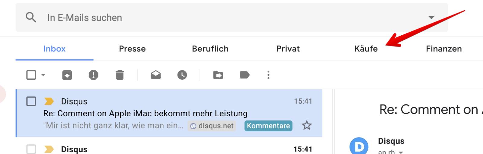 Zum Beispiel werfe ich einfach eine Suche nach label:purchases an und lege mir das dann als „Käufe“ auf ein Tab. Das klappt auch mit label:trips für Reisen oder mit anderen bekannten Inbox-Gruppen.