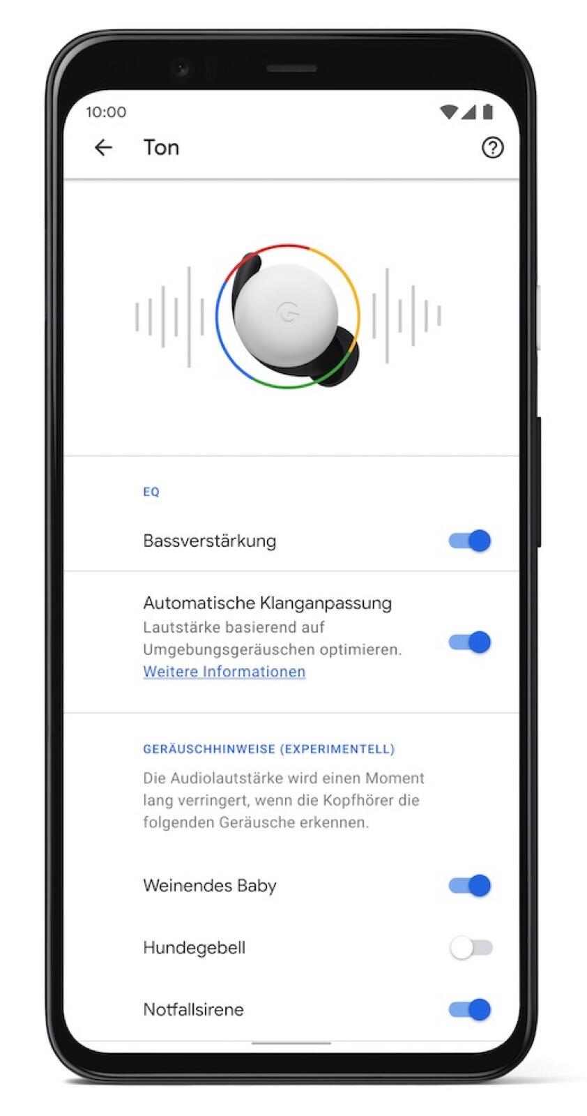 - Geräuschhinweise ist ein neues und experimentelles Feature, welches über Wichtiges in der Umgebung informiert. Wenn der Hund bellt, ein Baby weint oder ein Krankenwagen in der Nähe ist, verringern die Geräuschhinweise automatisch die Lautstärke der Pixel Buds.