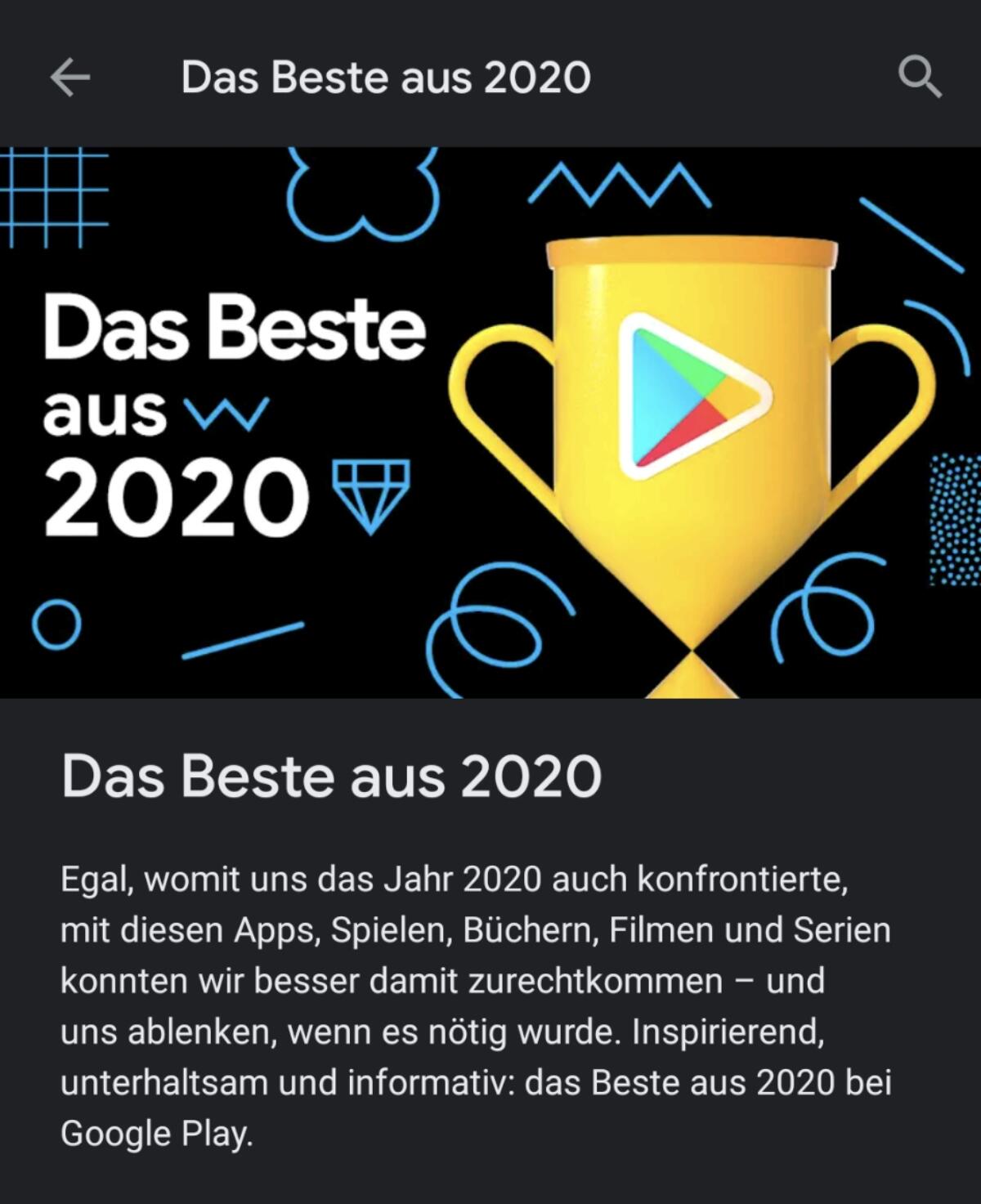 Mein Tipp lautet nun (für alle Nutzer mit einem Android-Smartphone): Öffnet den Google Play Store und schaut mal auf der Startseite vorbei. Dort solltet ihr ganz oben direkt einen neuen und großen Banner mit „Das Beste aus 2020“ sehen.