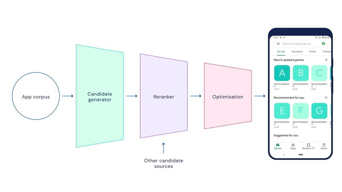 Doch es kommt natürlich auch vor, dass Nutzer den Store besuchen und einfach nur ein bisschen stöbern wollen. Da gibt es dann Vorschläge von einem Team von Google, aber auch KI-Vorschläge. Hier arbeitet Google mit DeepMind zusammen und gemeinsam versucht man möglichst kluge Vorschläge zu zeigen.