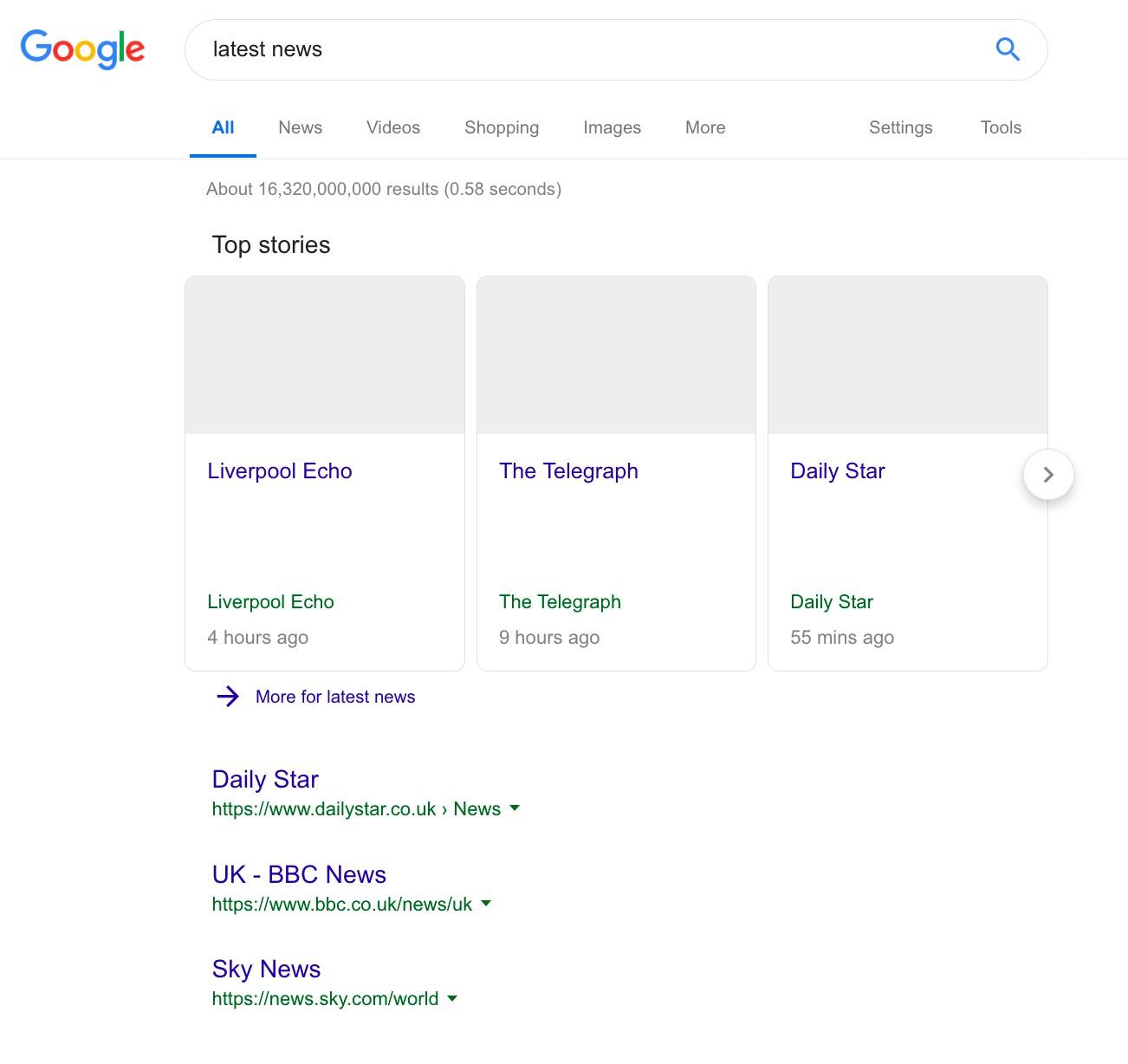 Eine andere Option, die man scheinbar testet, ist das Entfernen von Bildern, Überschriften, Textauszügen und URL-Endungen. Es bleibt quasi noch ein weißes Viereck und der Name der Webseite übrig. Google testet damit, was für einen Einfluss diese Änderung in den Google News haben könnte.