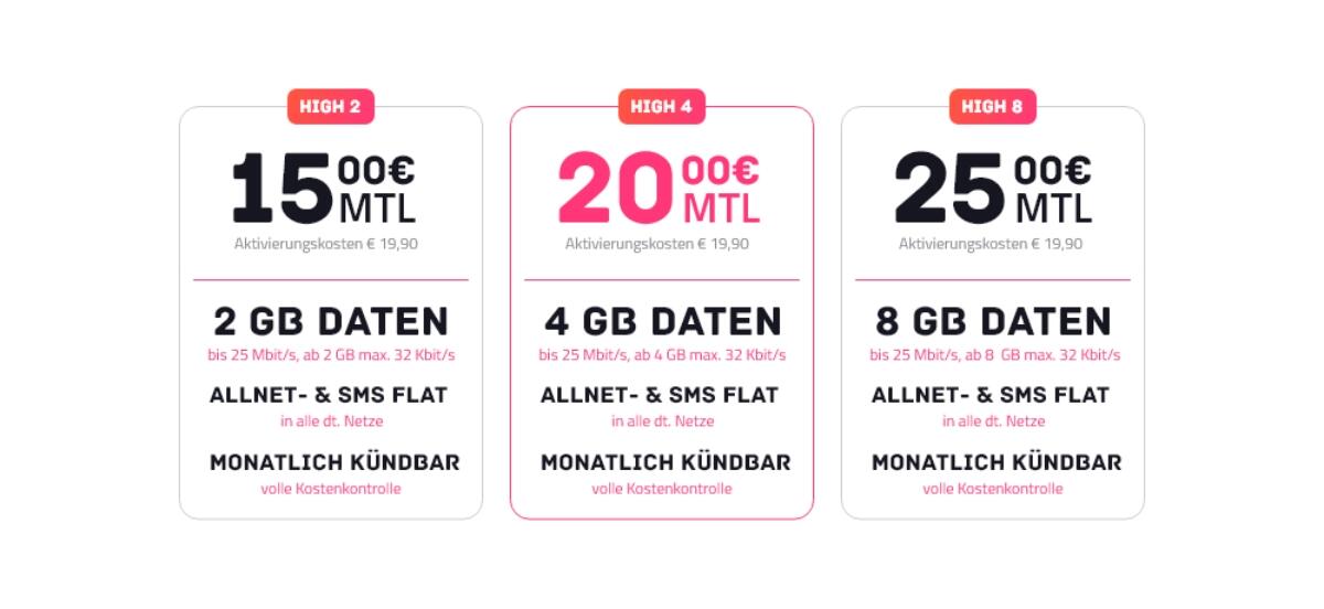 High nutzt das Telekom-Netz, es gibt mehrere Tarif-Optionen und man surft mit bis zu 25 Mbit/s im D-Netz – auf Wunsch kann man mit „HIGHspeed“ auch mit bis zu 50 Mbit/s surfen im LTE-Netz surfen, das kostet dann aber 5 Euro extra.