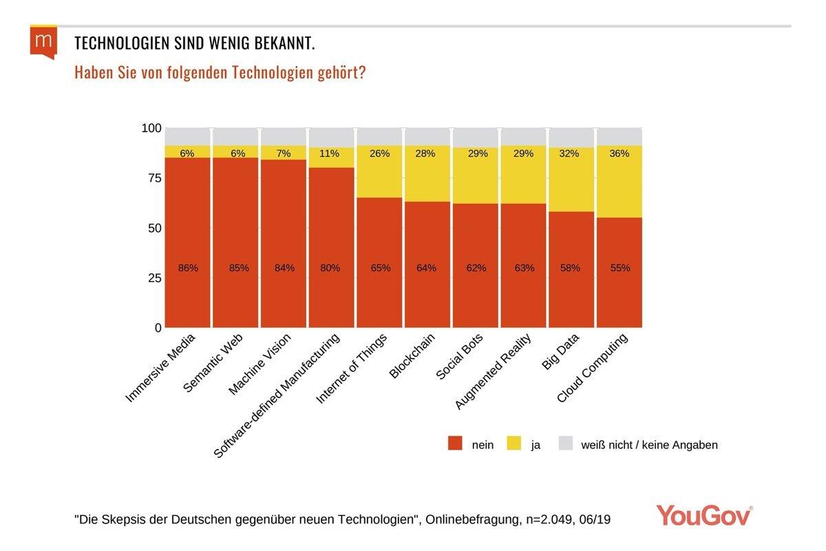 Abgefragt wurde darin der Kenntnisstand zu insgesamt zehn Technologien. Ziel war es, eine Antwort auf folgende Frage zu finden: Lässt sich die Skepsis gegenüber der Digitalisierung auf mangelndes Wissen zurückführen? Wer eine Technologie dem Namen nach kennt, hat zumindest zur Kenntnis genommen, dass es diese gibt. Doch davon kann in Deutschland kaum die Rede sein.