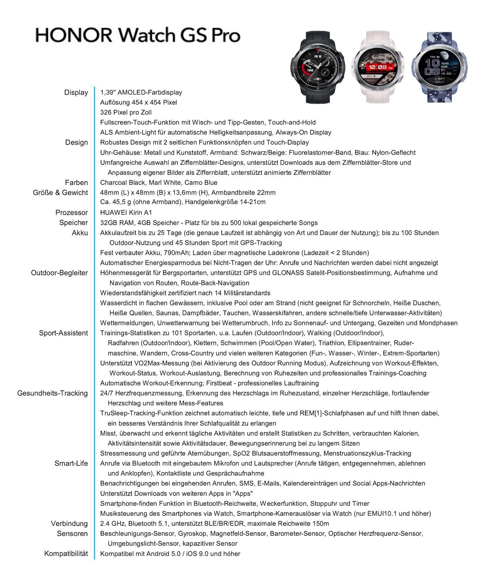 Die Honor Watch GS Pro besitzt ein 1,39 Zoll großes OLED-Display mit 454 x 454 Pixel, den Kirin A1, 32 MB RAM, 4 GB Speicher, eine Akkulaufzeit von bis zu 25 Tagen und diverse Fitness-Sensoren wie Pulsmesser und Schlaftracker.