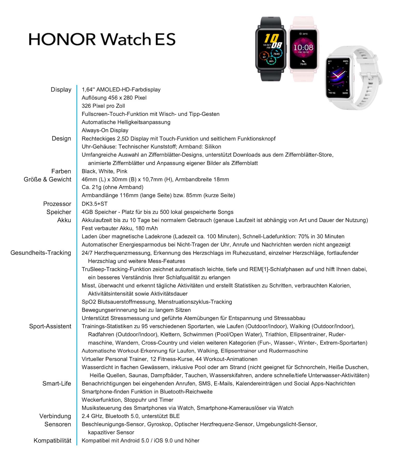 Die Honor Watch ES ist mit 99,90 Euro etwas günstiger und kommt mit einem 1,64 Zoll großen OLED-Display mit 456 x 280 Pixel daher. Es gibt 4 GB Speicher für die eigene Musik und eine Akkulaufzeit von bis zu 10 Tagen. Hier kommt noch ein Sp02-Sensor dazu, Plusmesser und Co. besitzt die Uhr natürlich auch.