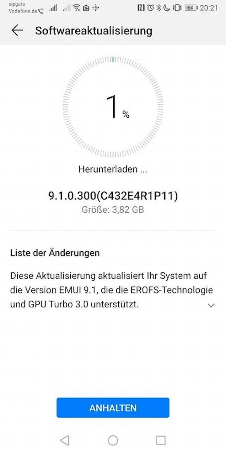 Solltet ihr ein Huawei Mate 10 Pro besitzen und sollte euch das Update heute bereits angeboten werden (Updates werden wie immer in Phasen verteilt), dann begegnet euch ein 3,82 GB großer Download, welcher euer Mate 10 Pro auf Version BLA-L29 9.1.0.300 (C432E4R1P11) anheben sollte.