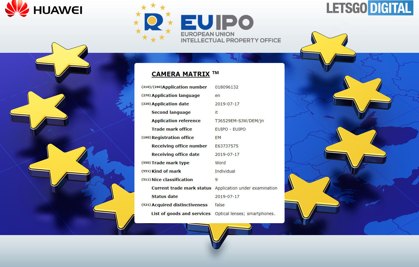Die Bezeichnung Camera Matrix liefert da schon weniger Hinweise, aber vielleicht setzt man dort an, wo das P30 Pro aufgehört hat: Bei der RYB-Matrix (statt RGB, also Rot, Grün und Blau, setzt man auf Rot, Gelb und Blau – also RYB). Dieser Name wurde ebenfalls am 17. Juli beim EUIPO von Huawei gesichert.