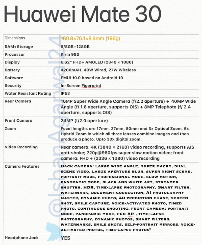 Kurz vor dem Mate-Event von Huawei machen aktuell zwei Listen die Runde im Netz, welche die Spezifikationen vom Huawei Mate 30 und Huawei Mate 30 Pro zeigen sollen. Die Details stammen von Ishan Agarwal, der mittlerweile eine gute und zuverlässige Quelle geworden ist. Bilder hat er auch noch geteilt.