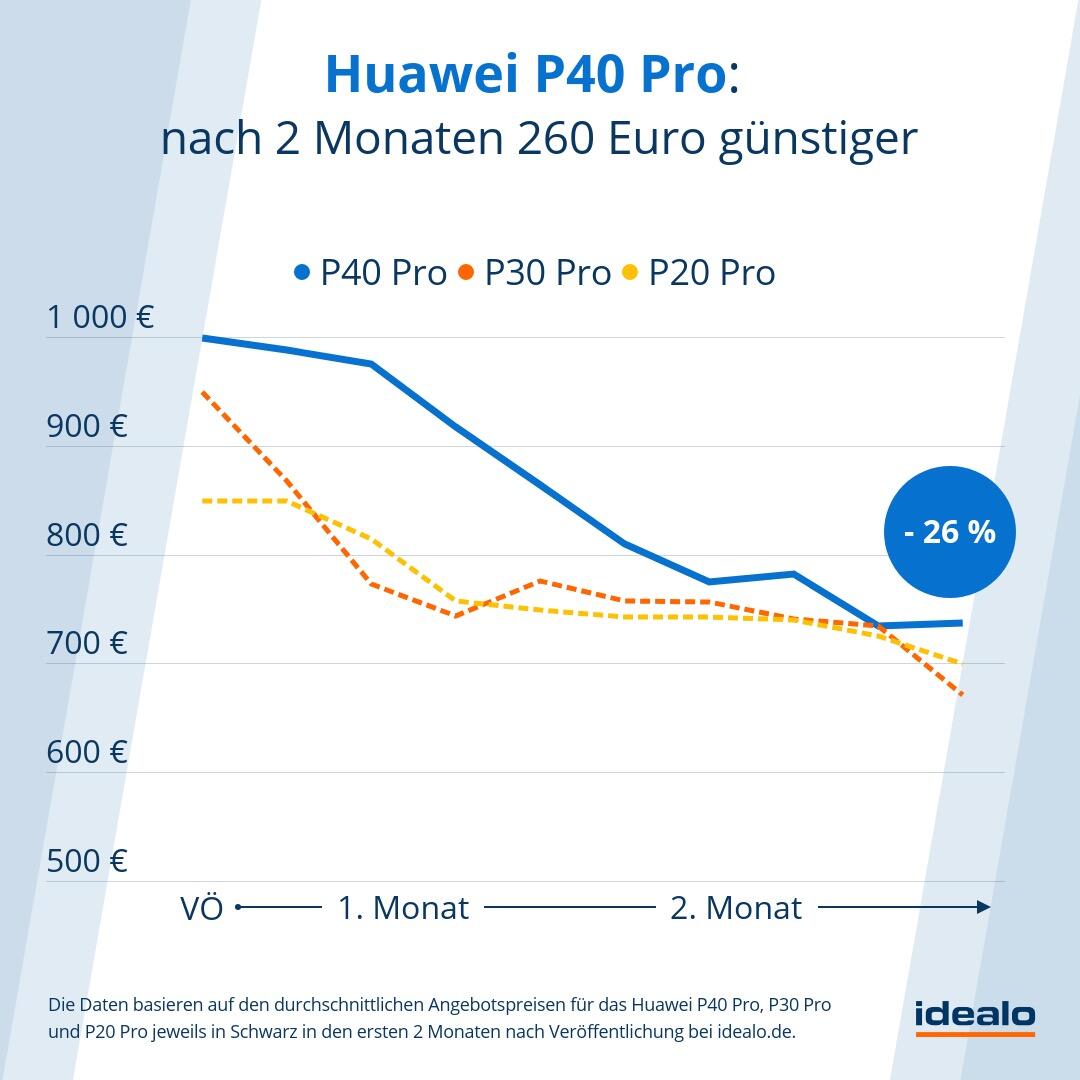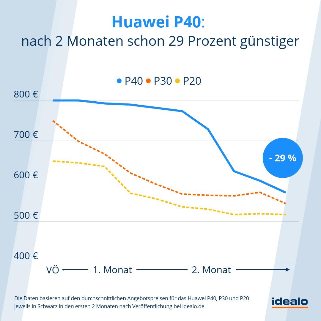 Dieser Preisverlust hat sich mit dem P40 dieses Jahr nochmals beschleunigt: Rund zwei Monate nach Veröffentlichung liegt der Preis des Huawei P40 bereits 29 Prozent unter der unverbindlichen Preisempfehlung (UVP) von 799 Euro. Damit sind seit Ende Mai 2020 schon Angebote von weniger als 600 Euro möglich.