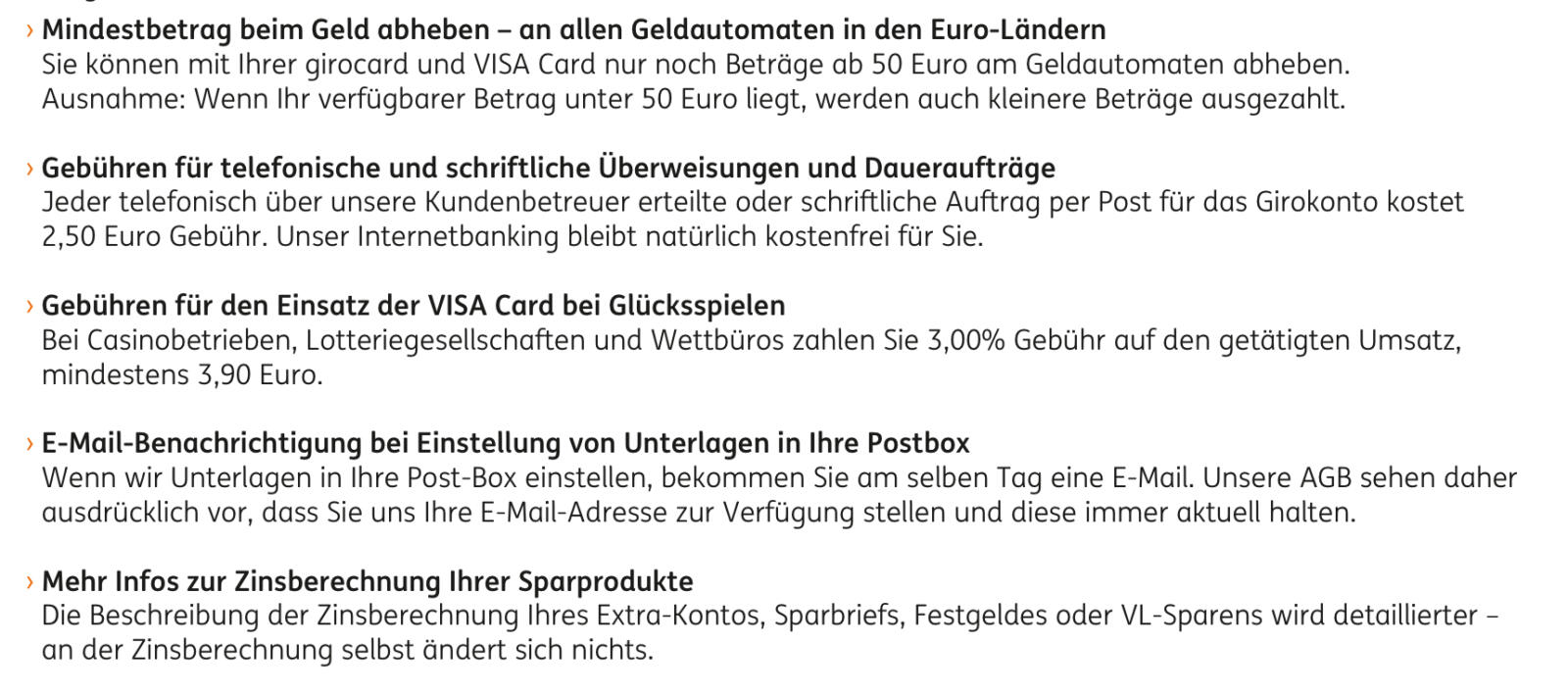 Auch wird man Gebühren für telefonische und schriftliche Überweisungen sowie Daueraufträge einführen. Weiterhin werden für den Visa-Einsatz im Glücksspielbereich zukünftig saftige Gebühren fällig.