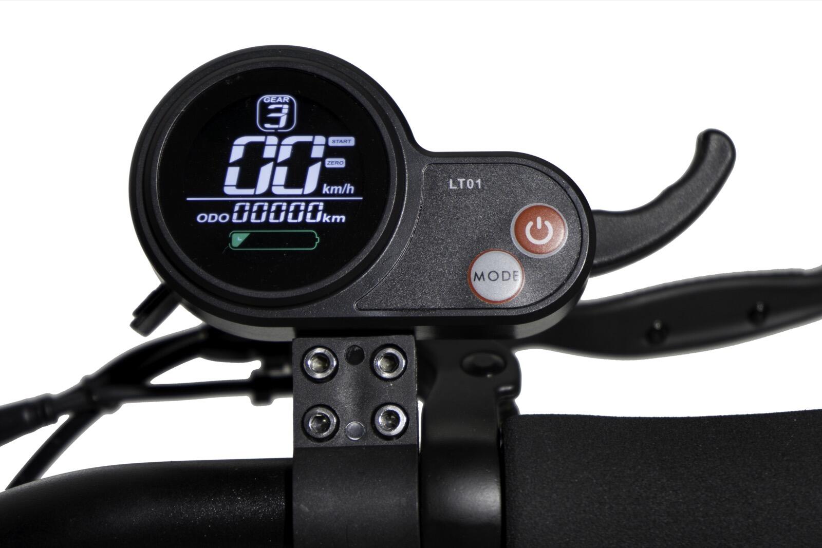 Über das Display lassen sich die 3 Geschwindigkeitsmodi einstellen (9 km/h / 14 km/h / 20 km/h). Es informiert über die aktuelle Geschwindigkeit, die gefahrene Zeit, den aktuellen Trip, die Batteriespannung sowie die gesamtgefahrenen Kilometer des E-Scooters.
