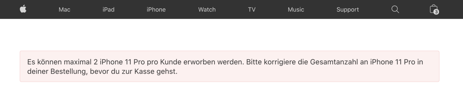 Es können maximal 2 iPhone 11 Pro pro Kunde erworben werden. Bitte korrigiere die Gesamtanzahl an iPhone 11 Pro in deiner Bestellung, bevor du zur Kasse gehst.