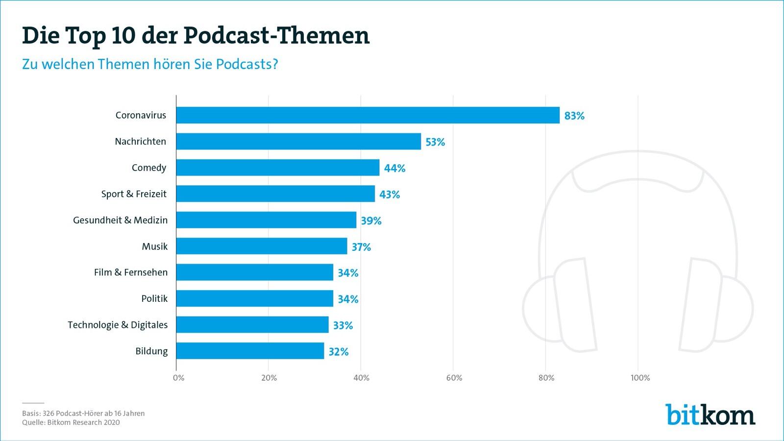 Satte 83 Prozent der Hörer geben an, Podcasts zum Coronavirus zu hören. Mit Abstand folgen Nachrichten (53 Prozent), Comedy (44 Prozent) sowie Sport und Freizeit (43 Prozent). Zwei von fünf Podcast-Hörern (39 Prozent) schalten allgemein bei Gesundheit und Medizin ein, ähnlich viele bei Musik-Podcasts (37 Prozent). Gleichauf liegen die Themen Film und Fernsehen, Politik (jeweils 34 Prozent der Hörer) sowie Technologie und Digitales (33 Prozent).