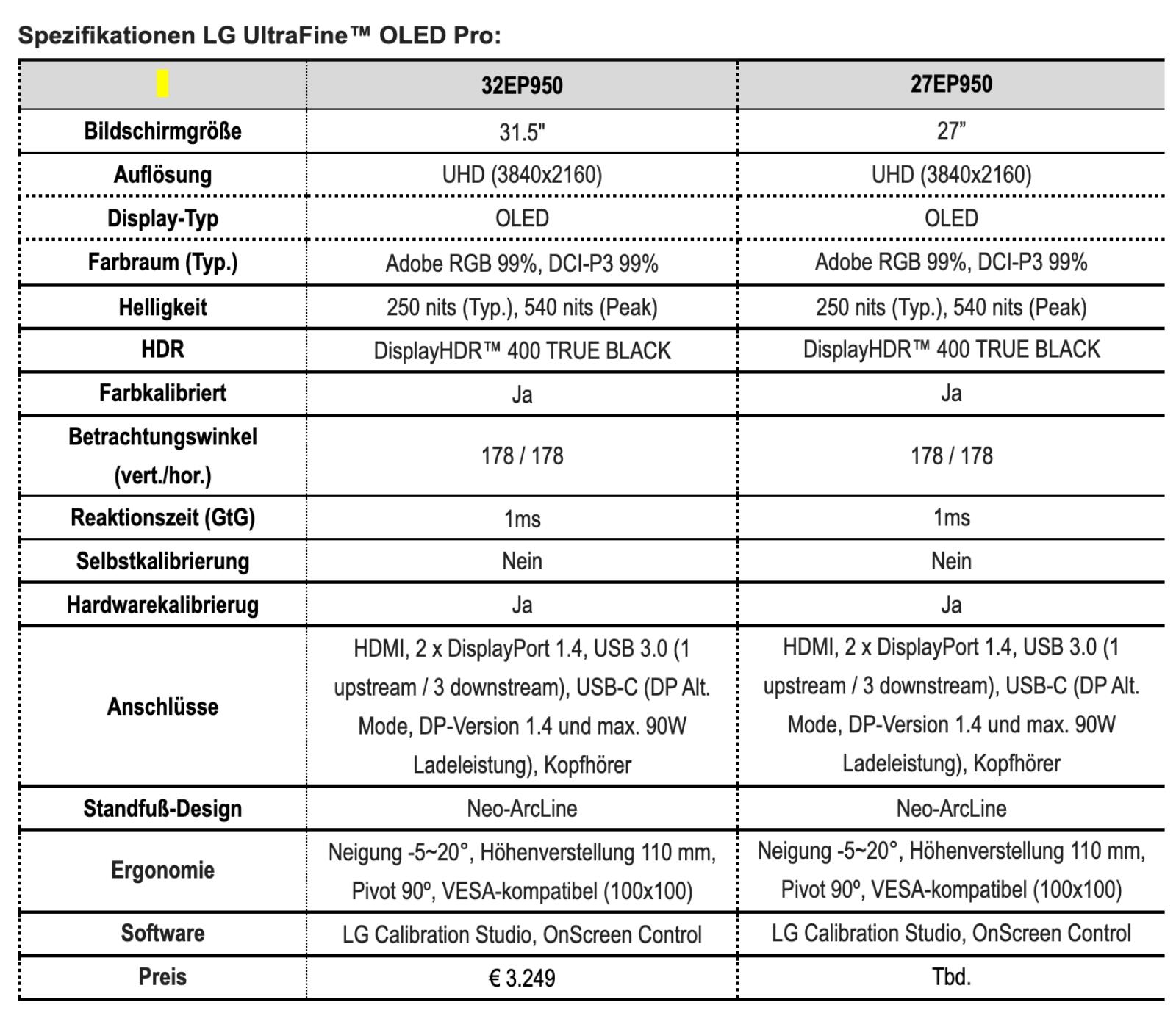 Den Anfang wird der LG 32EP950 machen, das ist die Version mit 31,5 Zoll. Diese kostet 3249 Euro und die deutsche Produktseite ist bereits online. Eine identische Version mit 27 Zoll folgt später, da hat LG aber noch keinen Preis genannt.