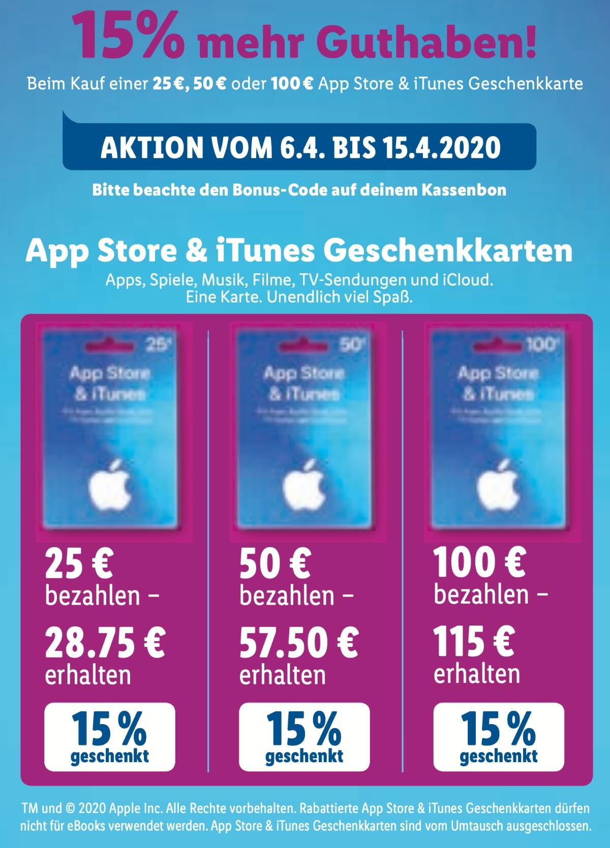 Heißt: Ihr müsst vom 6. bis zum 15. April eine Apple-Karte in einem LIDL eurer Wahl kaufen und den Kassenbon aufheben. Dort findet ihr einen Bonus-Code für das Extra-Guthaben, welches euch dann auf eurem Apple-Konto gutgeschrieben wird.