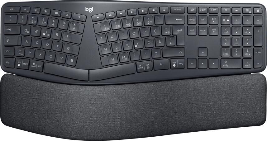 Das geschwungene Tastenfeld ist mit dem PerfectStroke-Tastensystem von Logitech ausgestattet. Mit Mac oder PC wird die Tastatur über Bluetooth Low Energy (BLE) oder den USB-Dongle verbunden. Weiter heißt es: