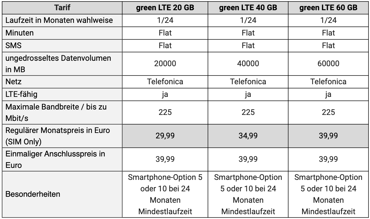 Ab sofort erweitert mobilcom-debitel ihre green Tarif-Familie um drei weitere Tarife. Das im Telefónica- Netz (aka o2) realisierte Angebot bietet drei neue Flatrates mit LTE max. und einem ungedrosselten Inklusivvolumen zwischen 20 und 60 GB, wie ihr der Tabelle unten entnehmen könnt. Das Angebot ist ab sofort für alle Neukunden zu haben.