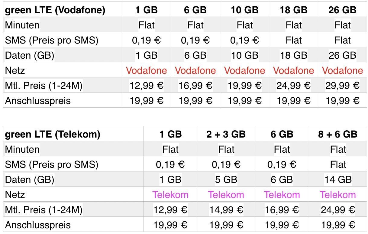 Der Tarif green LTE 6 GB funkt beispielsweise im Netz der Telekom, bietet eine 6 GB LTE Internet-Flat, eine Telefonie-Flat sowie EU-Roaming. Dafür werden in den ersten 24 Monaten 16,99 Euro pro Monat fällig. Für 8 Euro mehr gibt es im green LTE 8 + 6 GB nochmal 8 GB LTE-Datenvolumen und eine SMS-Flat obendrauf.