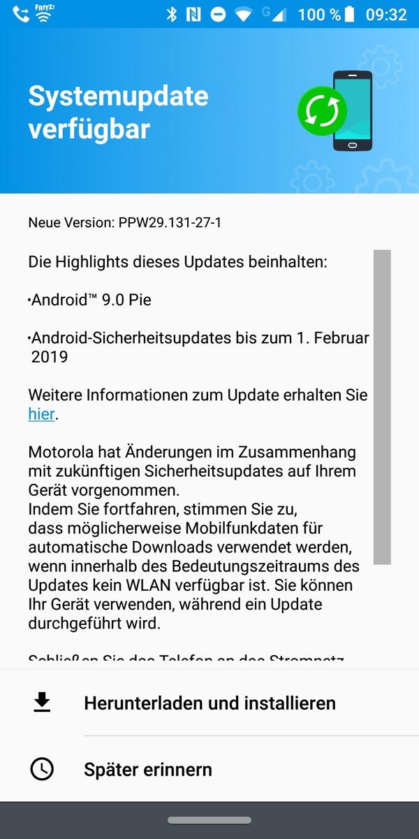 Ich habe ein moto z3 play hier und prüfe auf diesem regelmäßig die Verfügbarkeit neuer Updates. Heute war es nun endlich soweit, die etwa 980 MB große Aktualisierung PPW29.131-27-1 wurde mir zum Download angeboten.