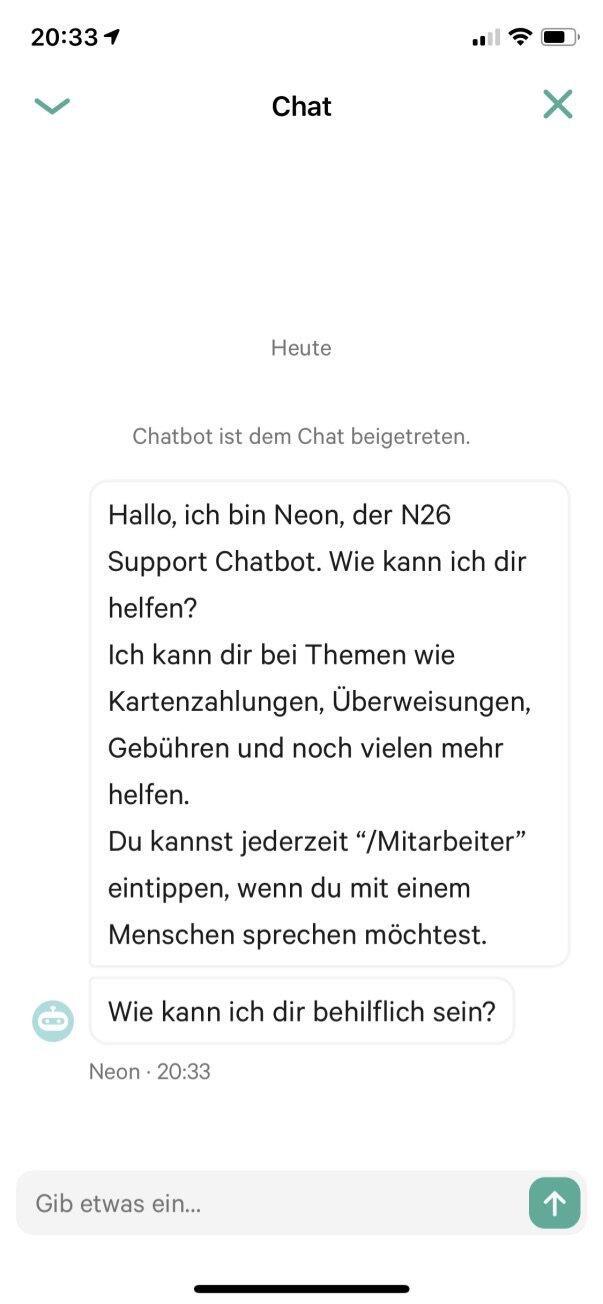 Der N26-Chatbot nennt sich „Neon“, ist in der N26-App platziert und funktioniert derzeit noch recht statisch. Für grundlegende und häufig gestellte Fragen ist er aber sicher recht nützlich. N26 stand schon häufiger in der Kritik, weil der Support schlecht erreichbar oder überlastet war.