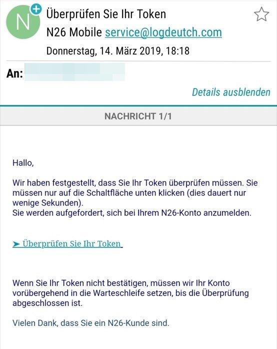 Kunden der „mobilen Bank“ N26 sind derzeit wieder oder auch immer noch Ziel von Phishing-E-Mails. Darauf haben uns mehrere Leser in den letzten Tagen hingewiesen.