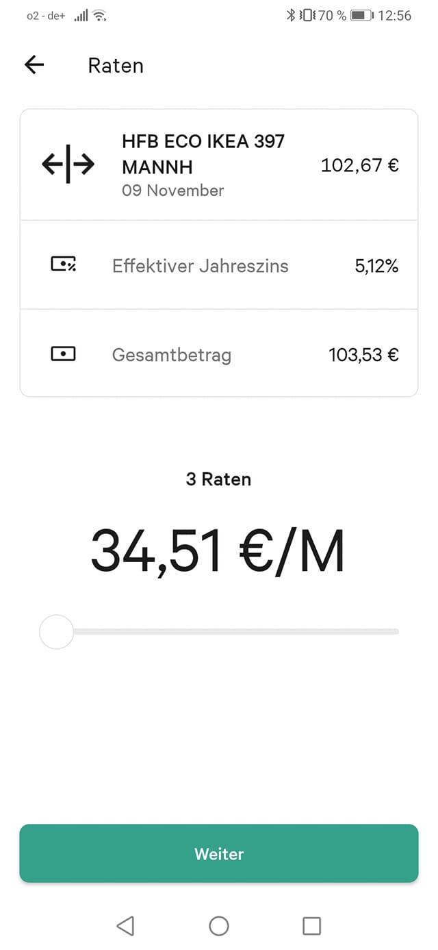 Uns wurden die folgenden Screenshots zur Verfügung gestellt, auf dem die neue Funktion bei einer Zahlung an IKEA zu sehen ist. Ein Dispo war in diesem Fall nicht aktiv, die Kriterien, wann die Ratenzahlung angeboten wird, sind noch unklar. Die Funktion wurde aber von N26 auch noch nicht offiziell vorgestellt.