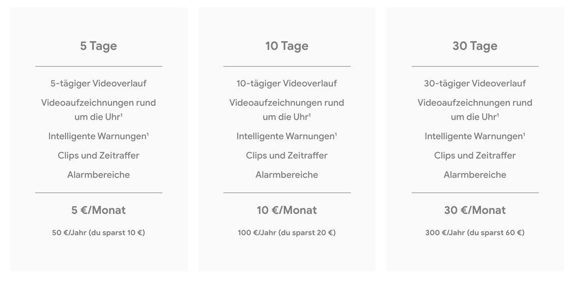 Es gibt nun ein Abo mit drei Optionen: 5 Euro, 10 Euro oder 30 Euro im Monat. Je nach Abo gibt es unterschiedliche Features, wobei sich eigentlich nur die Dauer der aufgezeichneten Daten ändert. Die Dauer der Tage erkennt man am Preis, für 10 Euro im Monat werden also zum Beispiel dann 10 Tage gespeichert.