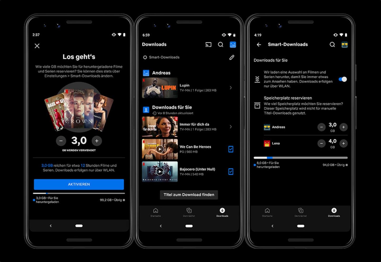 Diese Funktion ist nur in der mobilen App von Netflix verfügbar und kann unter „Downloads“ in den Einstellungen aktiviert werden. Man kann außerdem festlegen, wie viele Daten heruntergeladen werden sollen: 1 GB, 3 GB oder direkt 5 GB.