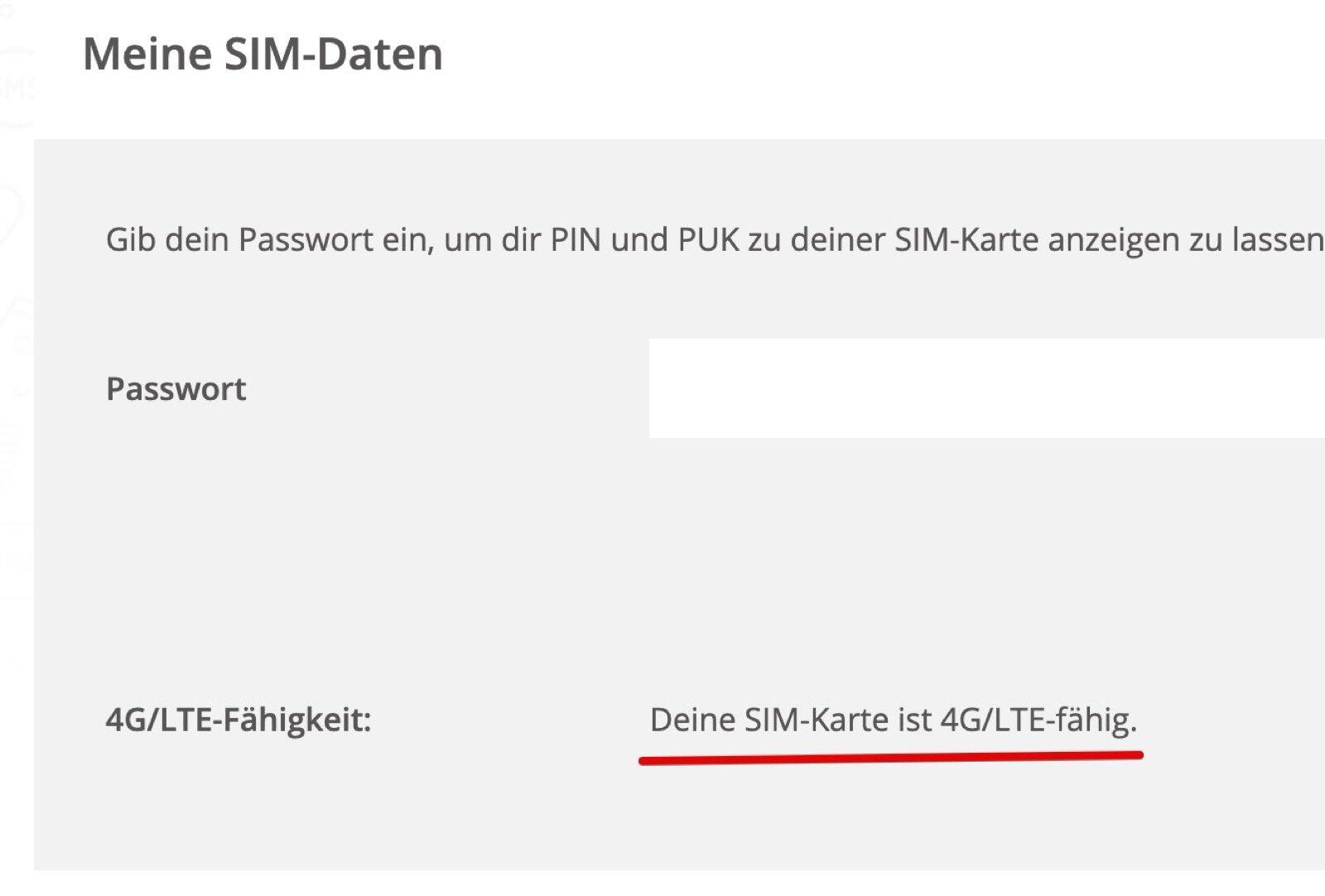 Unter „Meine Daten“ → „Meine SIM-Daten“ lässt sich die Information einsehen. Habt ihr eine alte SIM-Karte, steht dort dann: