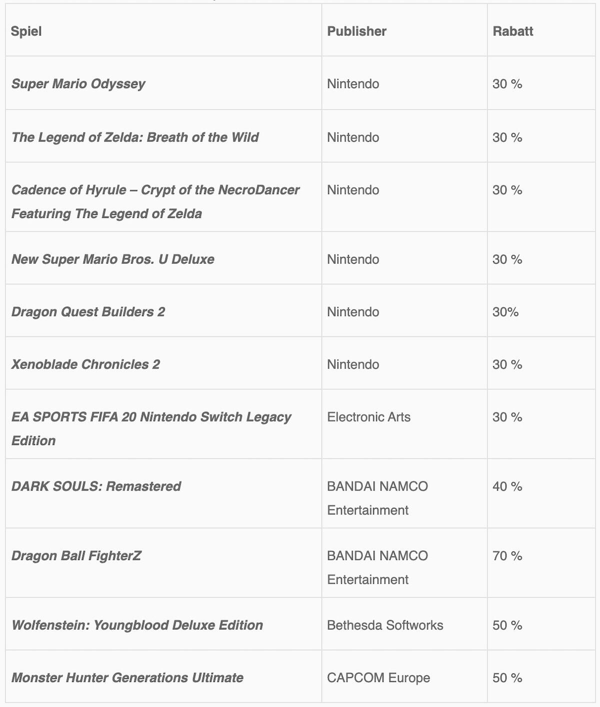 Highlights sind zum Beispiel Super Mario Odyssey, The Legend of Zelda: Breath of the Wild oder New Super Mario Bros. U Deluxe, die 30 Prozent günstiger als üblich angeboten werden. Nintendo verlangt die UVP im eShop, manchmal lohnt sich vorher ein Preisvergleich (es sei denn man will nur die digitale Version).