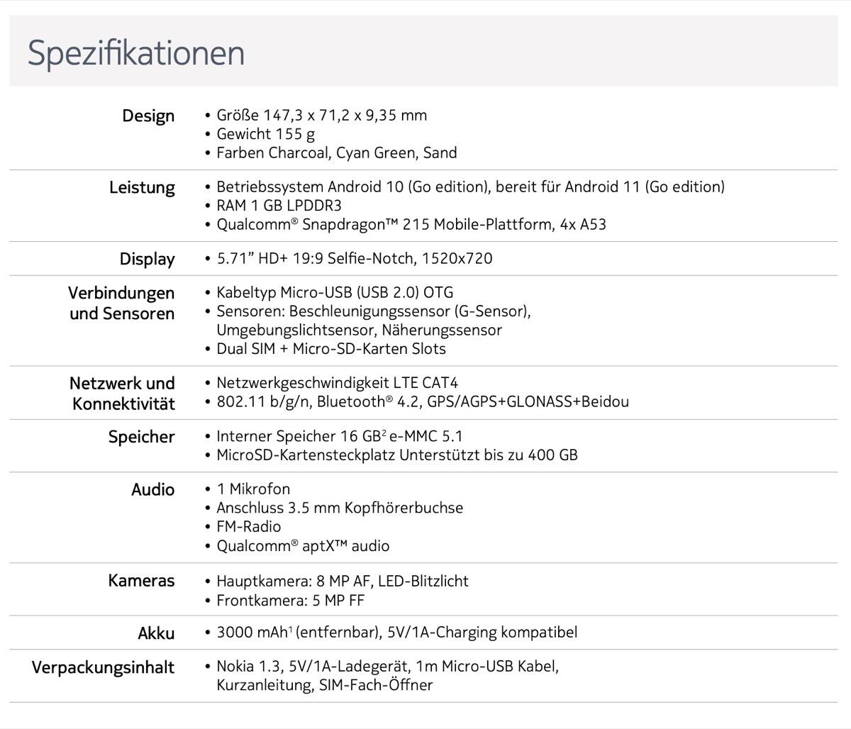 Nachfolgend noch ein Blick auf das vollständige Datenblatt des Nokia 1.3: