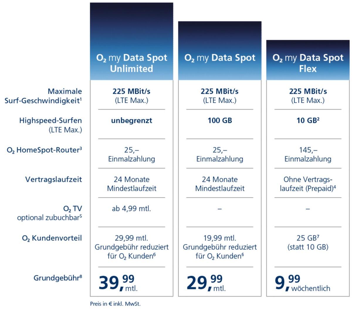 Entscheiden sich Kunden für die Tarife O2 my Data Spot 100 GB oder Unlimited, erhalten sie den LTE-Router von O2 zum Preis von einmalig 25 Euro. In Kombination mit O2 my Data Spot Flex kostet der O2 HomeSpot einmalig 145 Euro.
