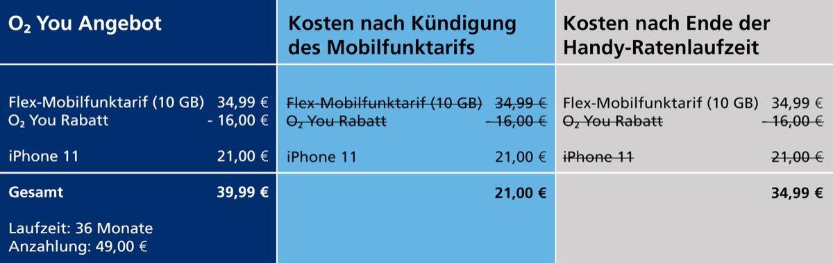 Im Detail: Für das Apple Top-Smartphone werden pro Monat 21 Euro fällig, für den flexiblen Mobilfunktarif 34,99 Euro. Auf letzteren gewährt o2 einen o2 You Rabatt von monatlich 16 Euro. Insgesamt erhält der Kunde über einen Zeitraum von drei Jahren Vergünstigungen in Höhe von 576 Euro.