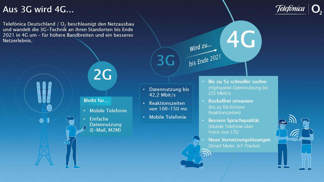Bis Ende 2021 wandelt der Netzbetreiber die vorhandene 3G-Technik in seinem o2 Netz in 4G-Technik um. Damit erfolgt die Umstellung ein Jahr früher als geplant. Kunden aller Marken von Telefónica Deutschland / o2 sind davon betroffen.