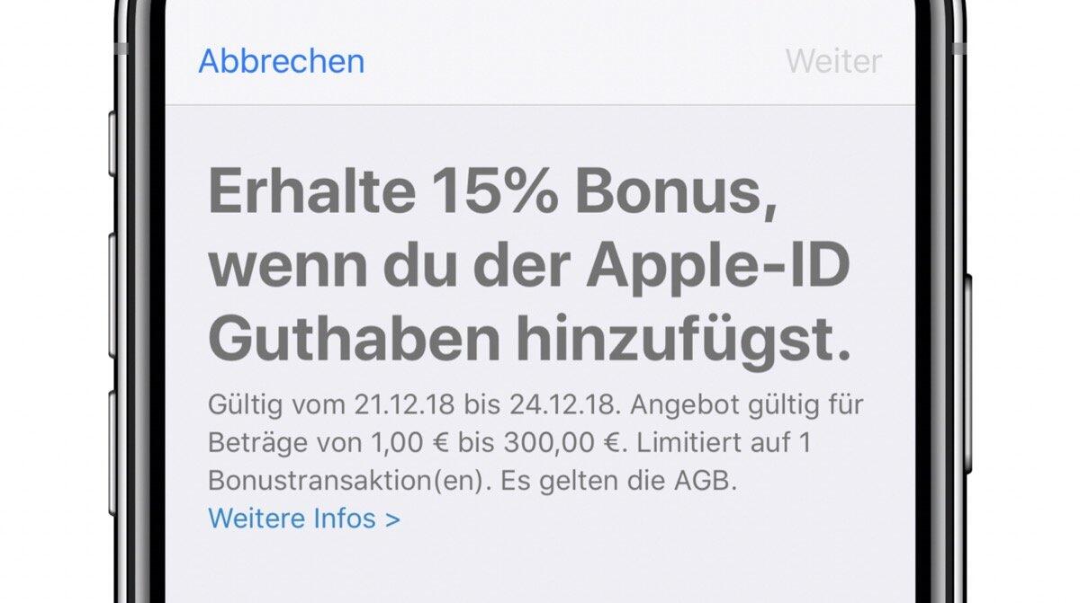 Ohne Umwege bietet nämlich Apple diese Möglichkeit selbst an, und zwar bis zum 24. Dezember 2018. Immerhin 15 Prozent Bonusguthaben kann man so erhalten.