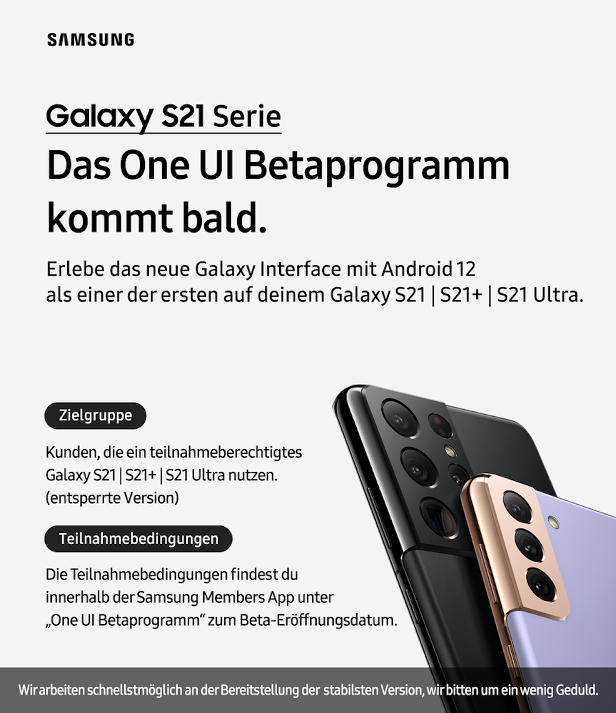Bedeutet: Das Samsung Galaxy S21, S21+ und S21 Ultra können bald mit der Beta von Android 12 getestet werden. Wie in den letzten Jahren läuft das über die App von Samsung (Members) ab, aber da werden wir euch noch informieren.