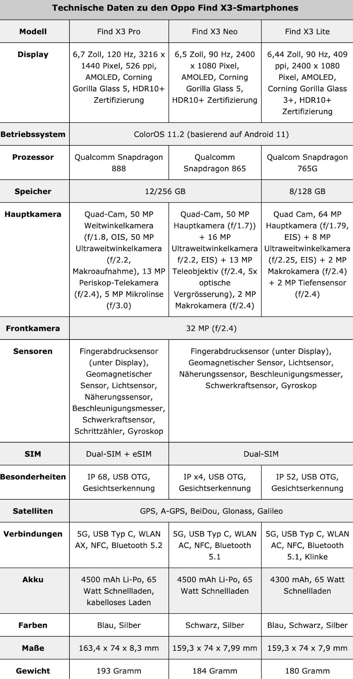 Oppo Find X3 Pro, Neo und Lite: Details vorab aufgetaucht