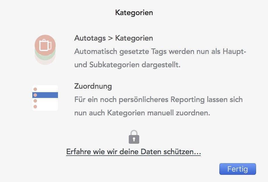 Automatisch gesetzte Tags werden nun als Haupt-Kategorien dargestellt, denen mehrere Sub-Kategorien zugeordnet sind. Dies erlaubt eine detaillierte Auswertung der Einnahmen und Ausgaben.