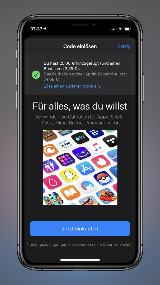 Das Angebot gilt bis zum 14. Juni 2020 um 19 Uhr und nur „solange der Vorrat reicht“. Der Bonusbetrag wird der Apple-lD der einlösenden Person beim Einlösen einer qualifizierten Geschenkkarte automatisch gutgeschrieben. Die Karte muss bis zum 30. Juni 2020 eingelöst werden, um den Bonus zu erhalten.