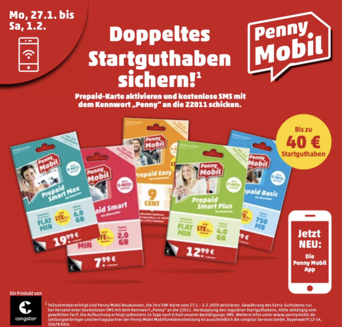 Bei Penny erhaltet ihr in der kommenden Woche die Starter-Pakete von Penny Mobil mit doppeltem Startguthaben. Somit können neue Kunden je nach Paket bis zu 40 Euro Startguthaben erhalten. Die Aktion läuft nur vom 27. Januar bis zum 1. Februar 2020.