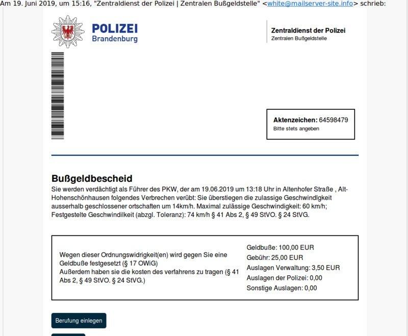 Mal wieder gibt es eine größere Welle E-Mails, die Schadsoftware verteilen sollen. Diesmal geht es um gefälschte Bußgeldbescheide, die per E-Mail im Namen der Polizei Brandenburg, dem Zentraldienst der Polizei bzw. der Zentralen Bußgeldstelle versendet werden.