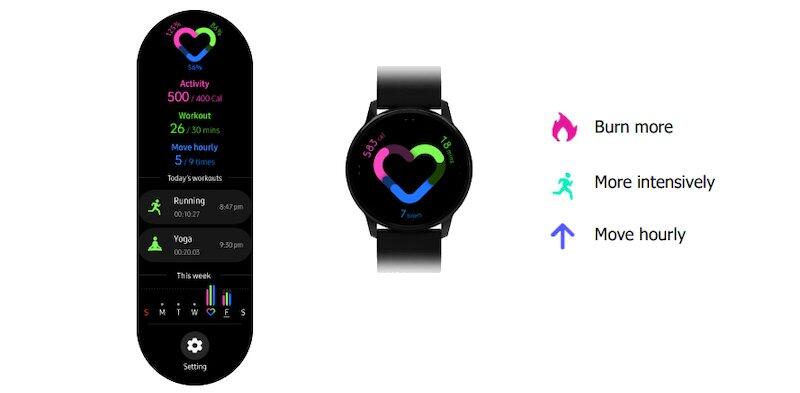 Die Galaxy Watch Active wird unter anderem neue Watchfaces bekommen und hat auch einige neue Fitness-Elemente. Das Herz mit den drei Farben erinnert stark an die drei Kreise der Apple Watch, auch hier gibt es einen Bereich für Kalorien, einen für 30 Minuten Workout und einen für Stehen.