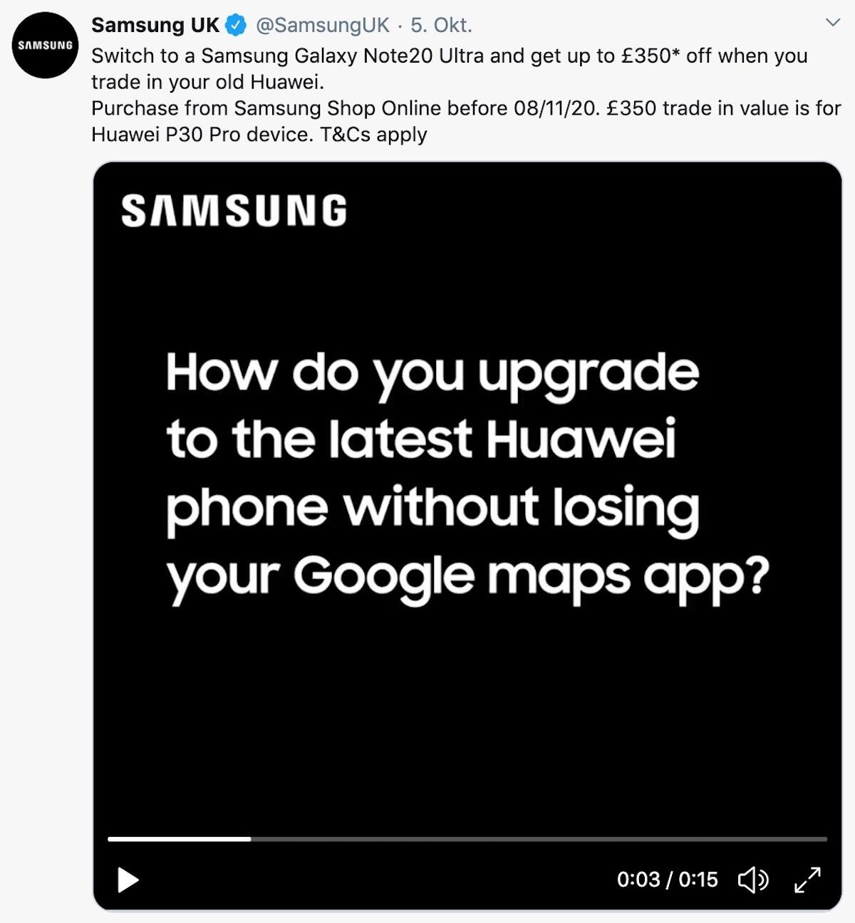 Huawei muss jetzt seit über einem Jahr ohne die Google-Apps auskommen, da man ins Visier der US-Regierung geraten ist. Samsung hat lange gewartet, nutzt diese Chance nun aber für einen Werbetweet, der aktuelle die Runde macht.