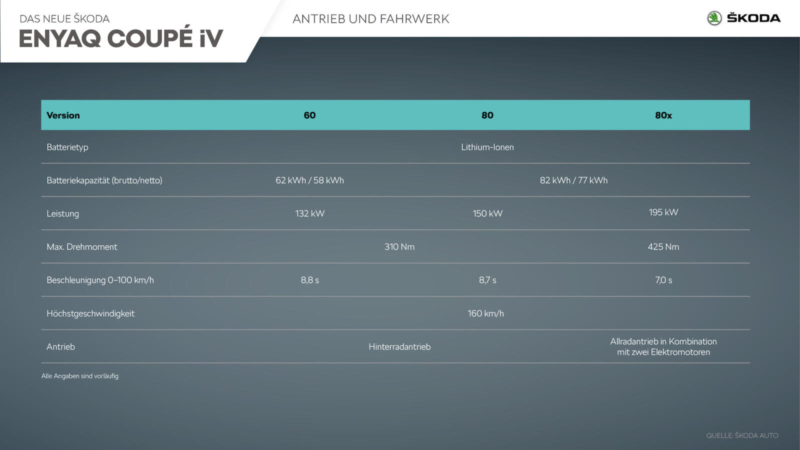 Die Sportline und 20 Zoll Felgen werden beim Coupé zum Standard gehören und es gibt drei Versionen: 60, 80 und 80x. Die Basis kommt auf 132 kW mit einem 58 kWh großen Akku, die mittlere Version auf 150 kW mit einem 77 kWh großen Akku und das x-Modell ist die Allradversion mit dem großen Akku und 195 kW.
