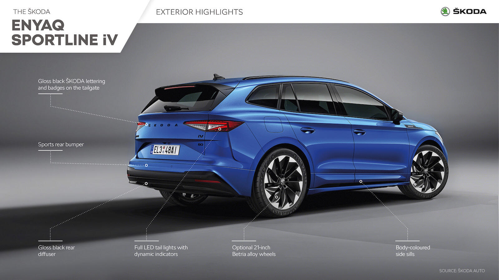 Der Škoda ENYAQ Sportline iV wurde optisch etwas angepasst und sitzt tiefer und er soll ein dynamisches Fahrvergnügen liefern. Die sportliche Version wird es mit 180 PS, mit 204 PS und Ende 2021 als Dual-Motor-Version mit 265 PS geben. Man kann einen Akku mit 62 kWh (WLTP: 400 km) oder 82 kWh (WLTP: 520 km) wählen.