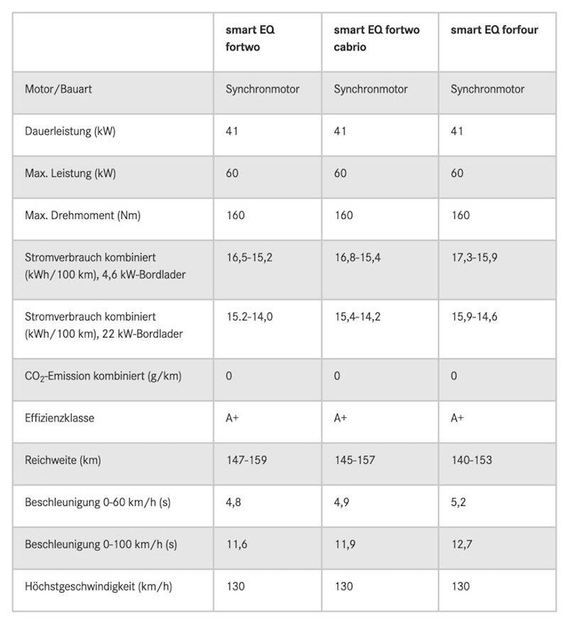 Von Smart wird es drei neue Modelle geben: Den Smart EQ fortwo, den Daimler auch als Cabrio auf den Markt bringen möchte und den Smart EQ forfour. Die Reichweite der drei Modelle liegt jeweils bei knapp 150 Kilometern (NEFZ).