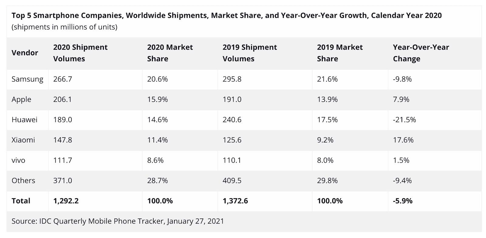 Doch ein Hersteller musste mächtig Federn lassen, und zwar Huawei. Laut IDC gab es hier einen Einbruch von über 40 Prozent. Huawei konnte also (im Vergleich zum Vorjahresquartal) fast nur noch die Hälfte an Einheiten verkaufen und liegt damit sogar direkt auf Platz 5 hinter Oppo. 2020 war vermutlich der Wendepunkt.