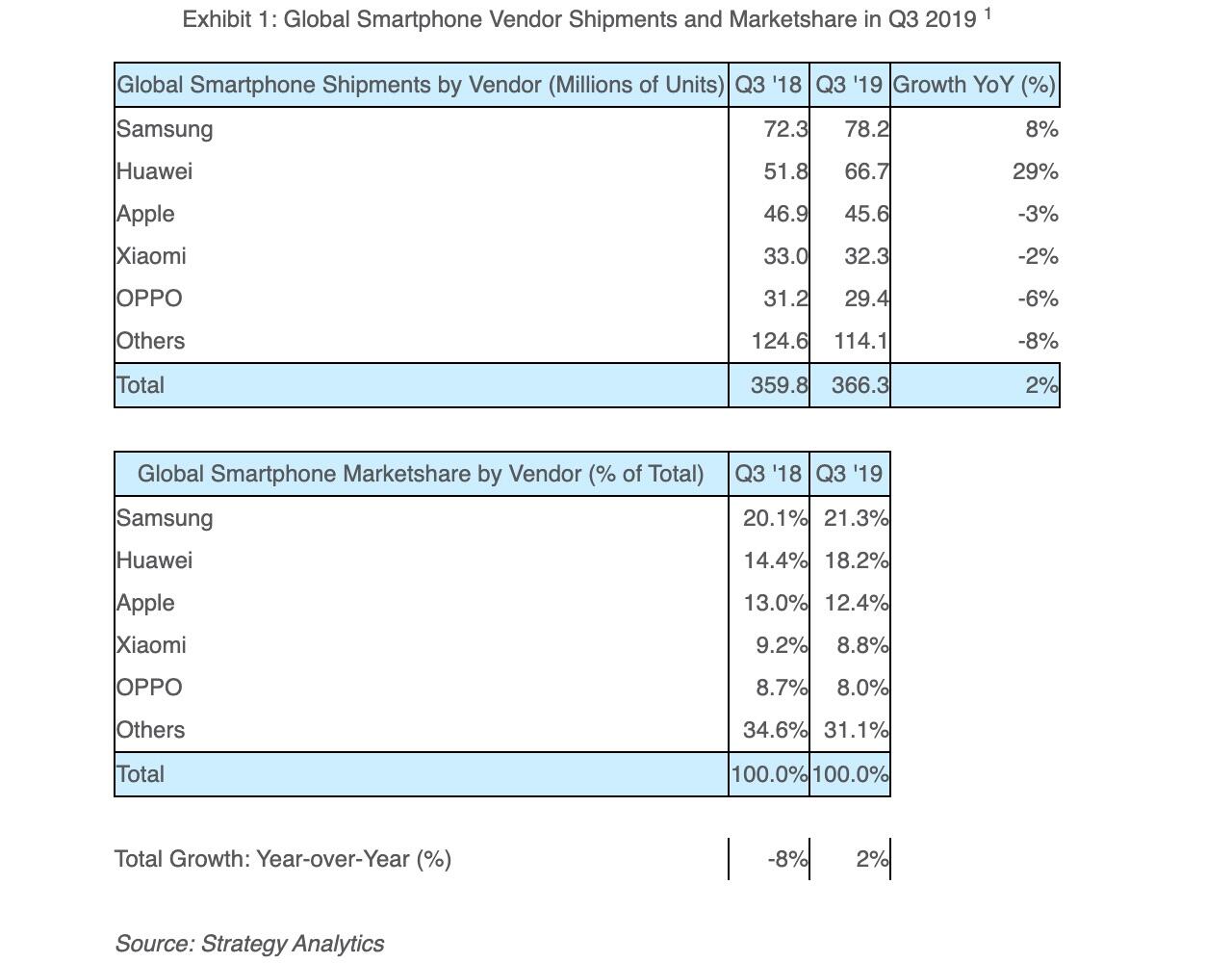 Laut deren Analyse ist der Markt im dritten Quartal um 2 Prozent (im Vergleich zum Vorjahresquartal) gestiegen. Knapp 366 Millionen Einheiten wurden wohl in Q3 2019 verkauft, über 6 Millionen Einheiten mehr als in Q3 2018. Doch für das Wachstum sind aktuell eigentlich nur zwei Hersteller verantwortlich.
